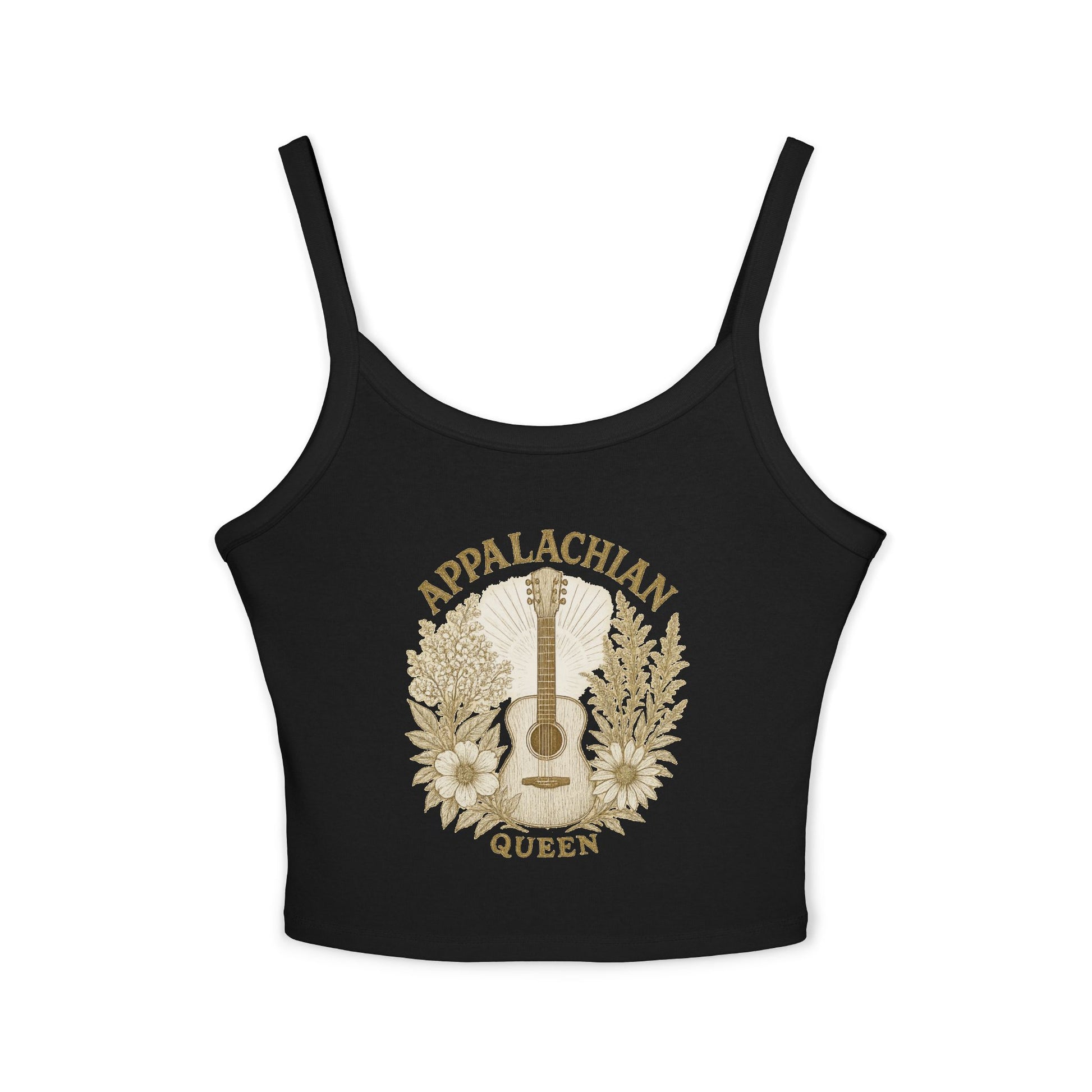 Cropped spaghetti strap tank featuring Appalachia Queen from our Cobalt Sessions collection. Offers a comfortable and supportive fit with thick straps, perfect for layering or wearing on its own. Gives off a trendy and stylish vibe, suitable for young adults. Ideal for summer wear, music festivals, or casual outings.