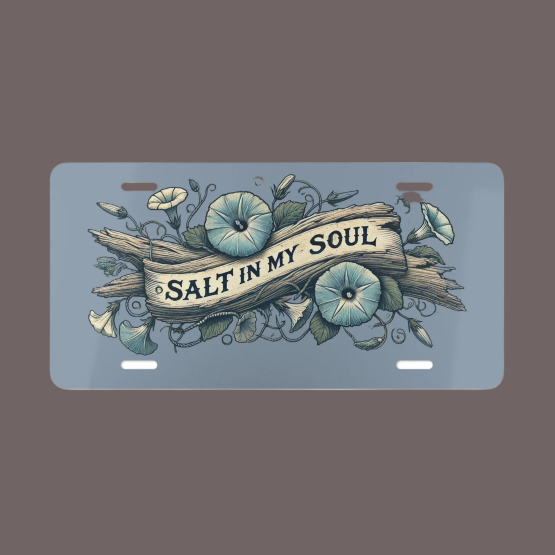 Let your love for the sea ride with you wherever you go. Our Salt in My Soul aluminum vanity plate features a serene driftwood and morning glory design, bringing coastal charm to any vehicle. Whether you're a beachcomber at heart, a road-tripping mermaid, or just someone who finds peace in the ocean breeze, this plate adds a gentle, summery touch to your car, camper, or coastal decor.