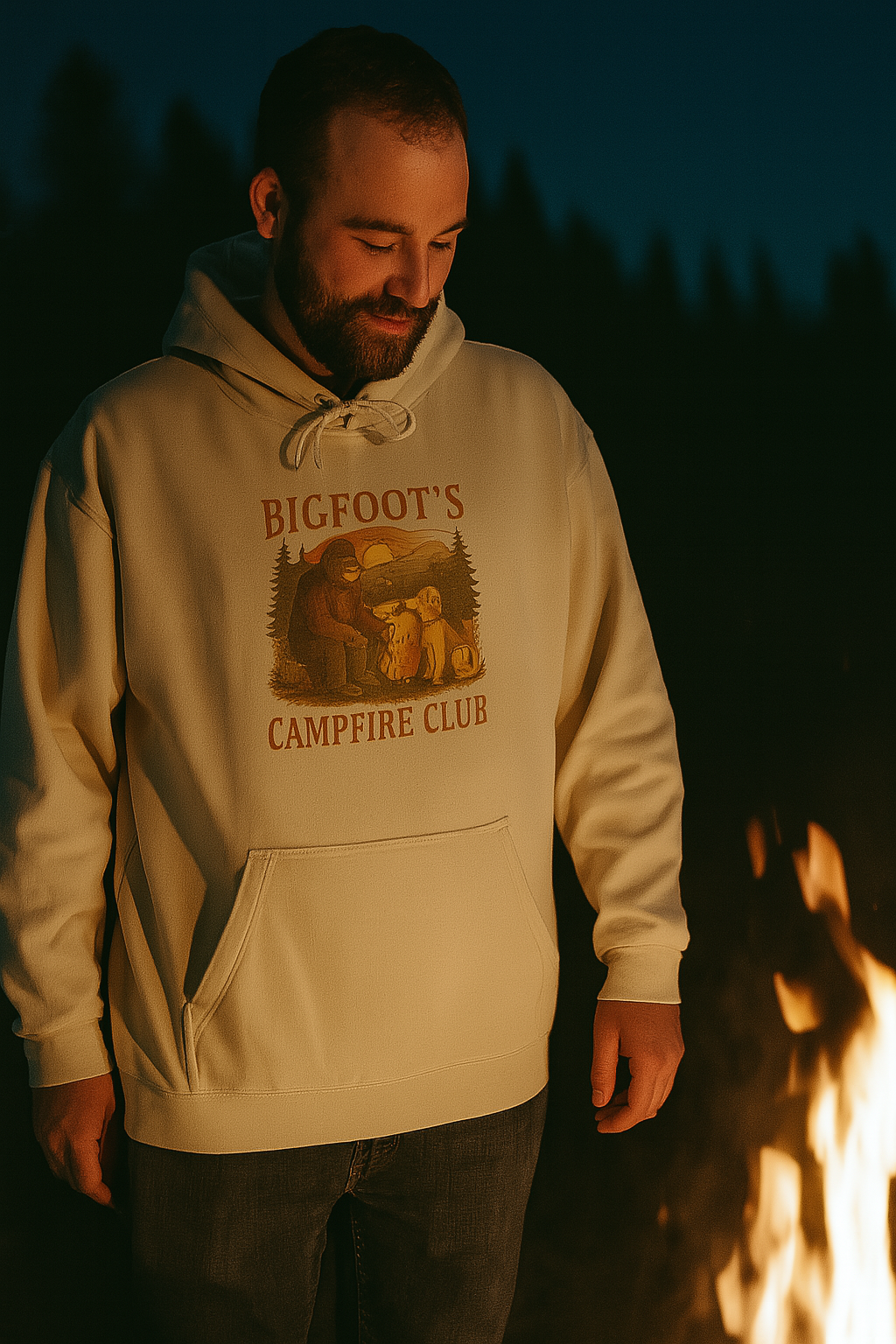 Stay cozy and stylish with this Bigfoot's Campfire Club hoodie featuring bigfoot by the fire with his labrador under a beautiful mountain scene. Perfect for outdoor enthusiasts and those who love cryptid creatures. Ideal for camping trips, bonfires, and casual wear during fall and winter.