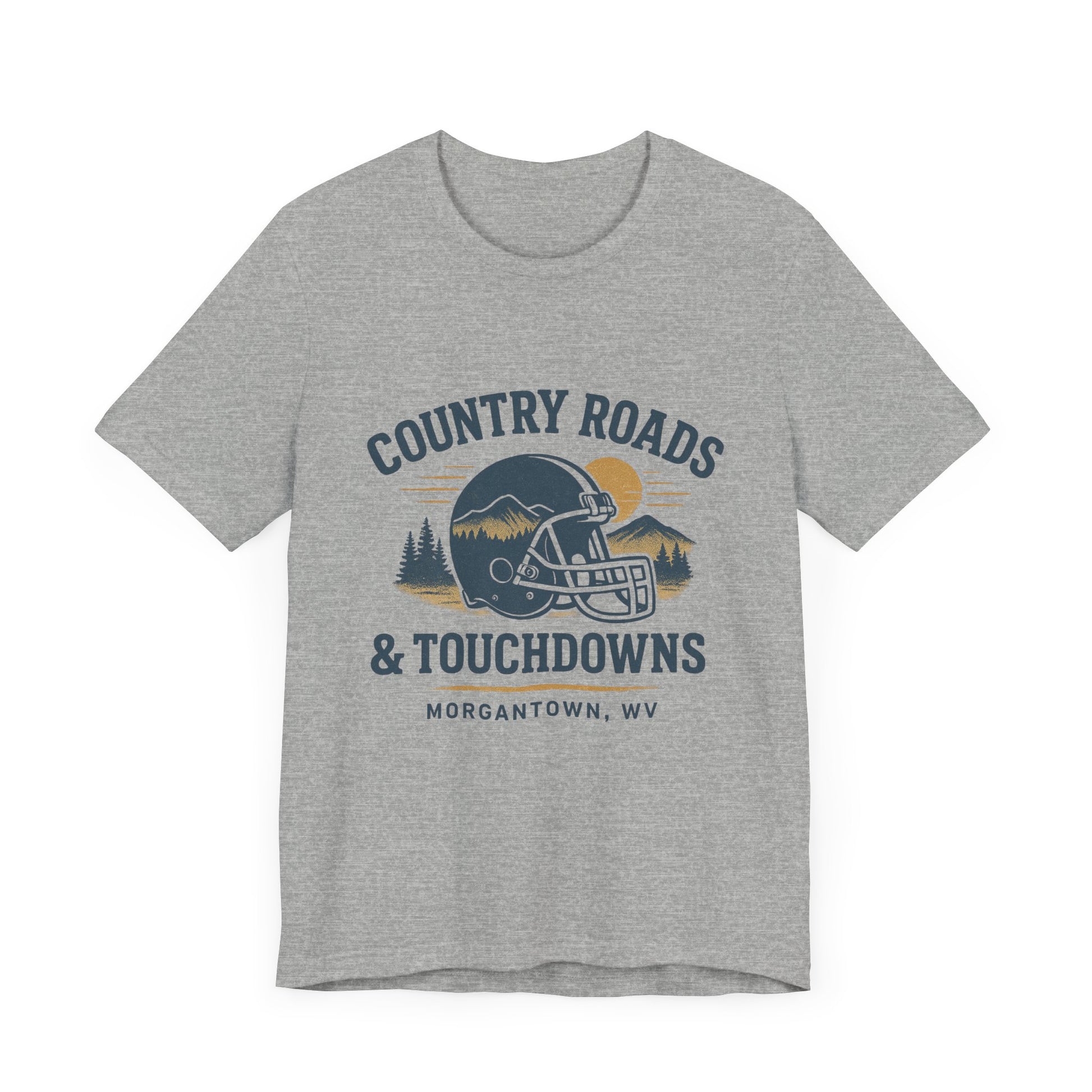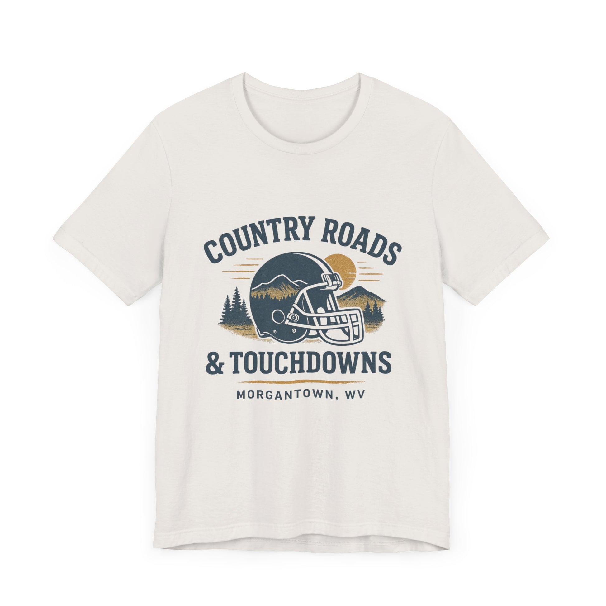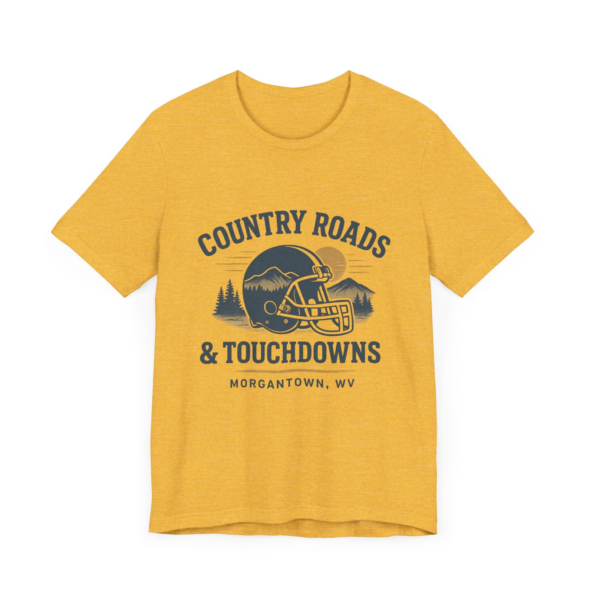 Country roads, crisp air, and college game day. This retro-style “Country Roads & Touchdowns” tee is a tribute to everything we love about fall Saturdays in West Virginia. Whether you’re tailgating in Morgantown, cheering from home, or just living for small-town pride and John Denver singalongs, this shirt brings the perfect mix of football spirit and Appalachian soul. Perfect for: students, alumni, and Fall football lovers and tailgate queens Game day gifts for her or him Anyone who believes Country Roads really do take you home Design Details: Vintage-inspired typography in bold, clear lettering Cozy unisex fit — soft and flattering for all Printed on high-quality cotton/poly blend Designed to pair with denim, boots, and your best yellin’ voice Care: Wash inside out in cold water, tumble dry low or hang to dry. Grab one for yourself and one for your favorite game-day buddy — this one’s a fall classic.