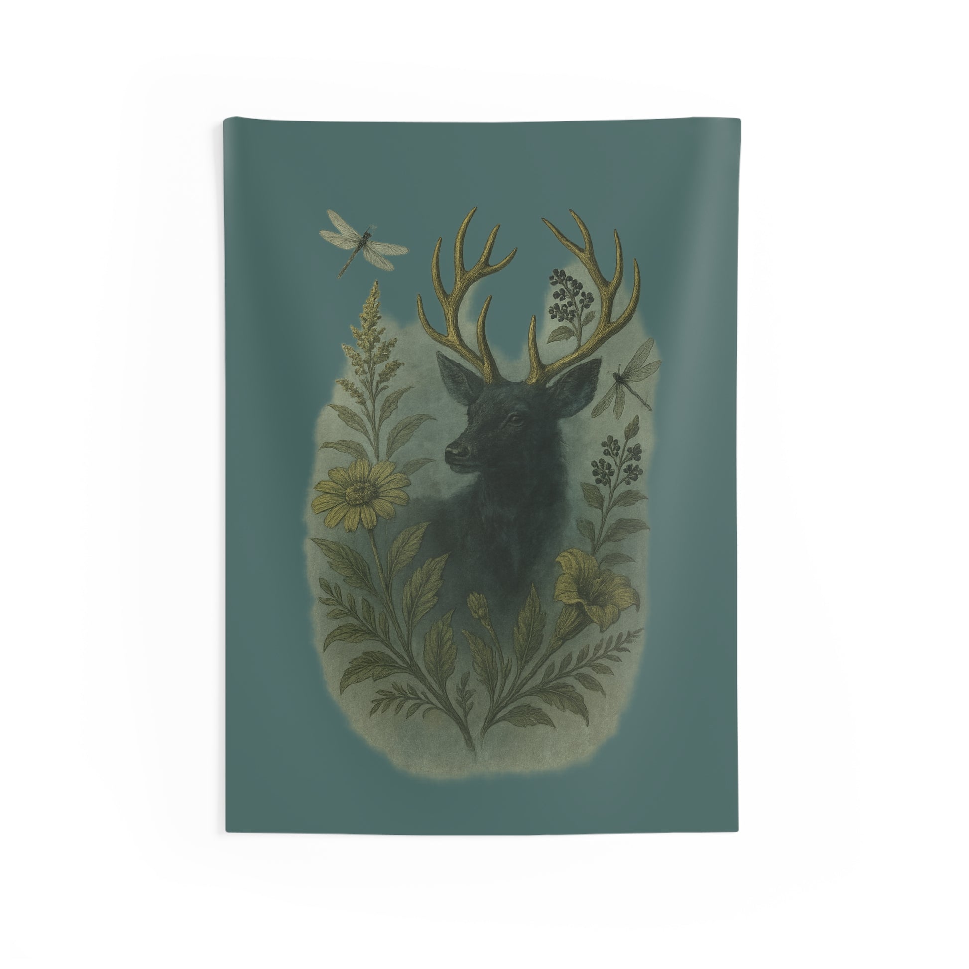 Bring a touch of woodland magic into your space with this enchanting tapestry. Featuring a majestic stag surrounded by delicate golden florals and dragonflies, this piece combines timeless natural elements with a rich teal-green background. Perfect as a statement wall hanging, bedspread accent, or cozy backdrop, it adds warmth and character to any room.
