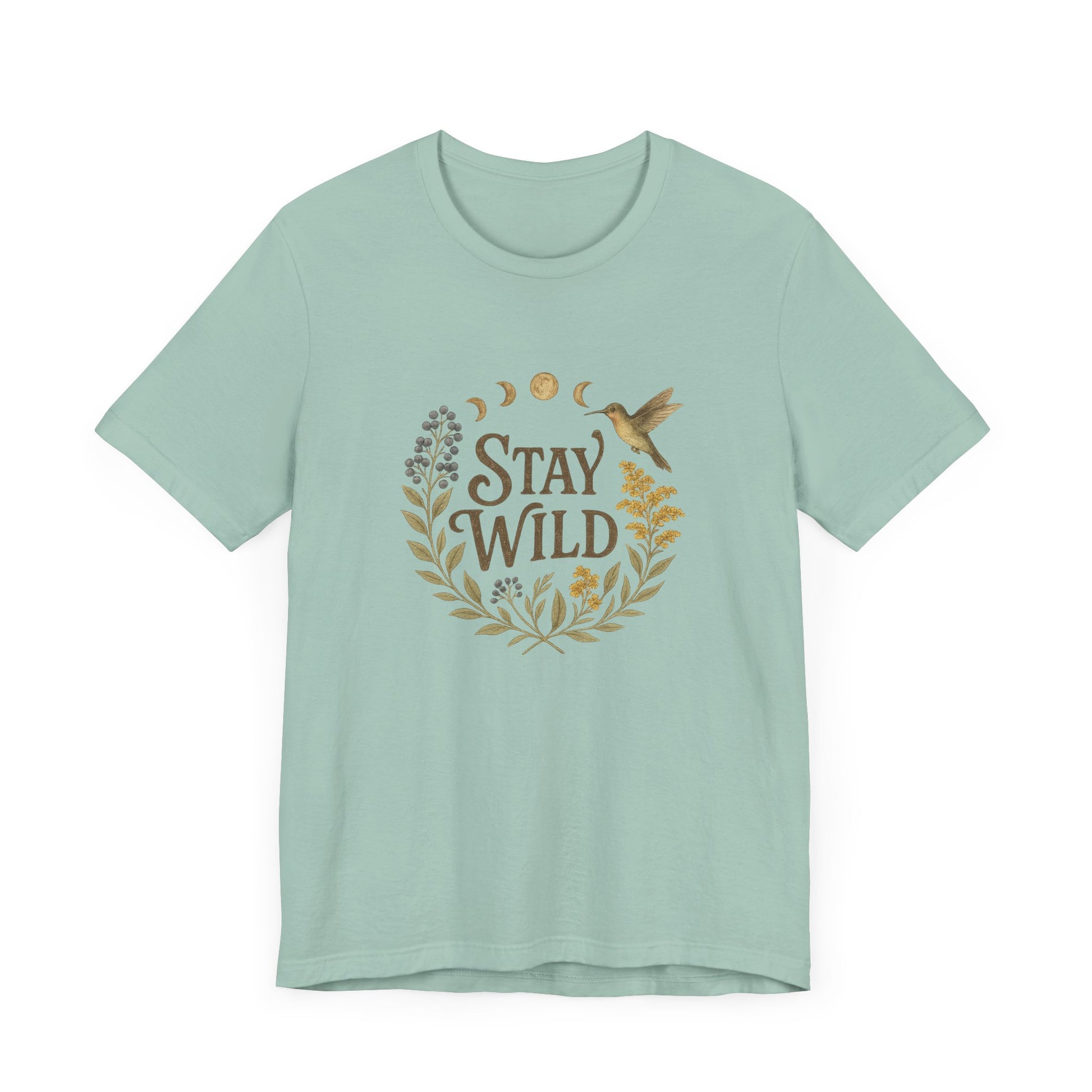 Enchanted stay wild hummingbird t-shirt in beautiful colors with the moon phases and a nature vibe. Perfect for nature lovers and those who appreciate mystical designs. Ideal for casual wear and can be a thoughtful gift for birthdays, Mother's Day, or any nature-themed celebration.