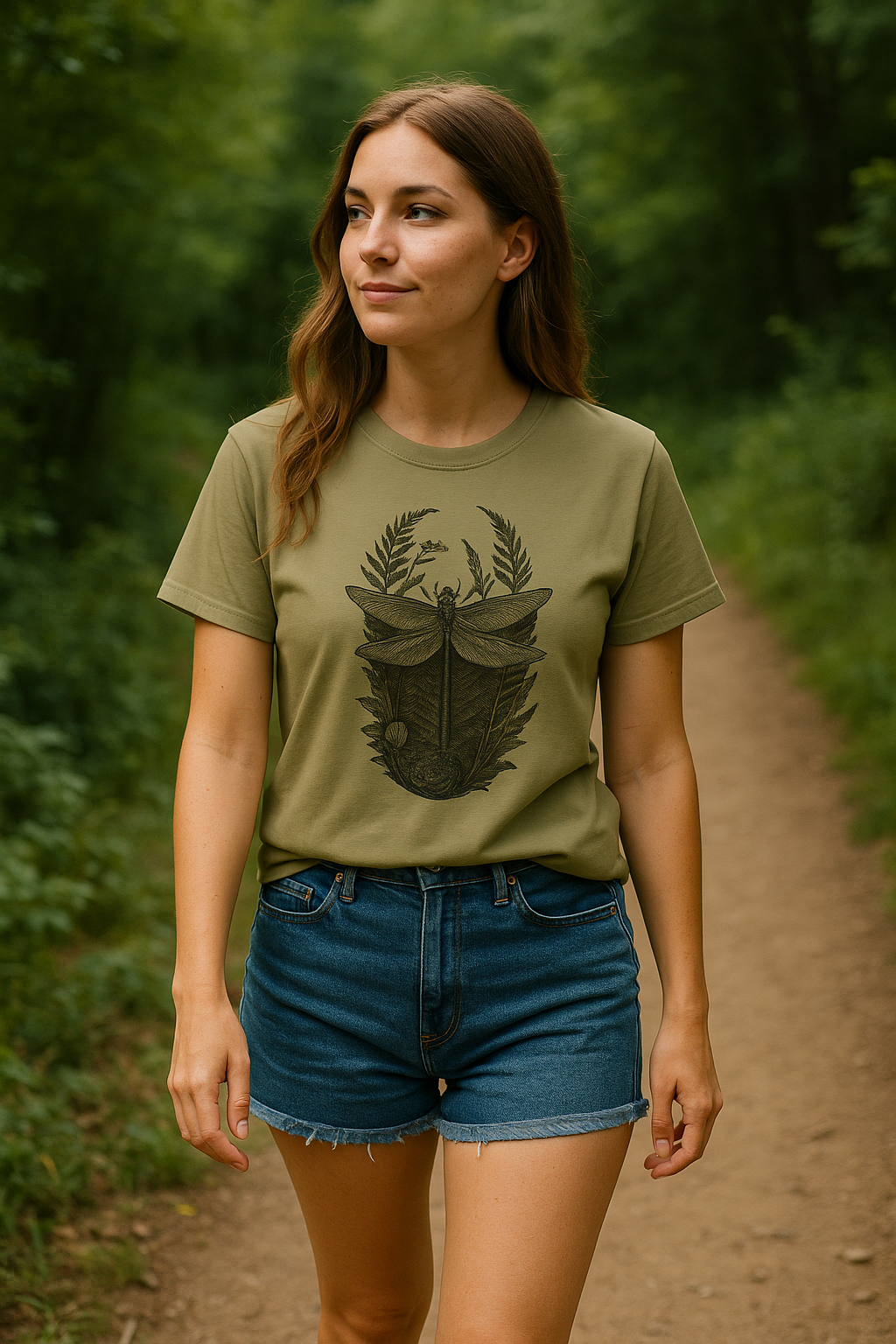 The Fern & Flight Dragonfly Tee brings together vintage illustration and earthy mystique in a quiet tribute to the still places—where water lilies float, ferns unfurl, and dragonflies dance.