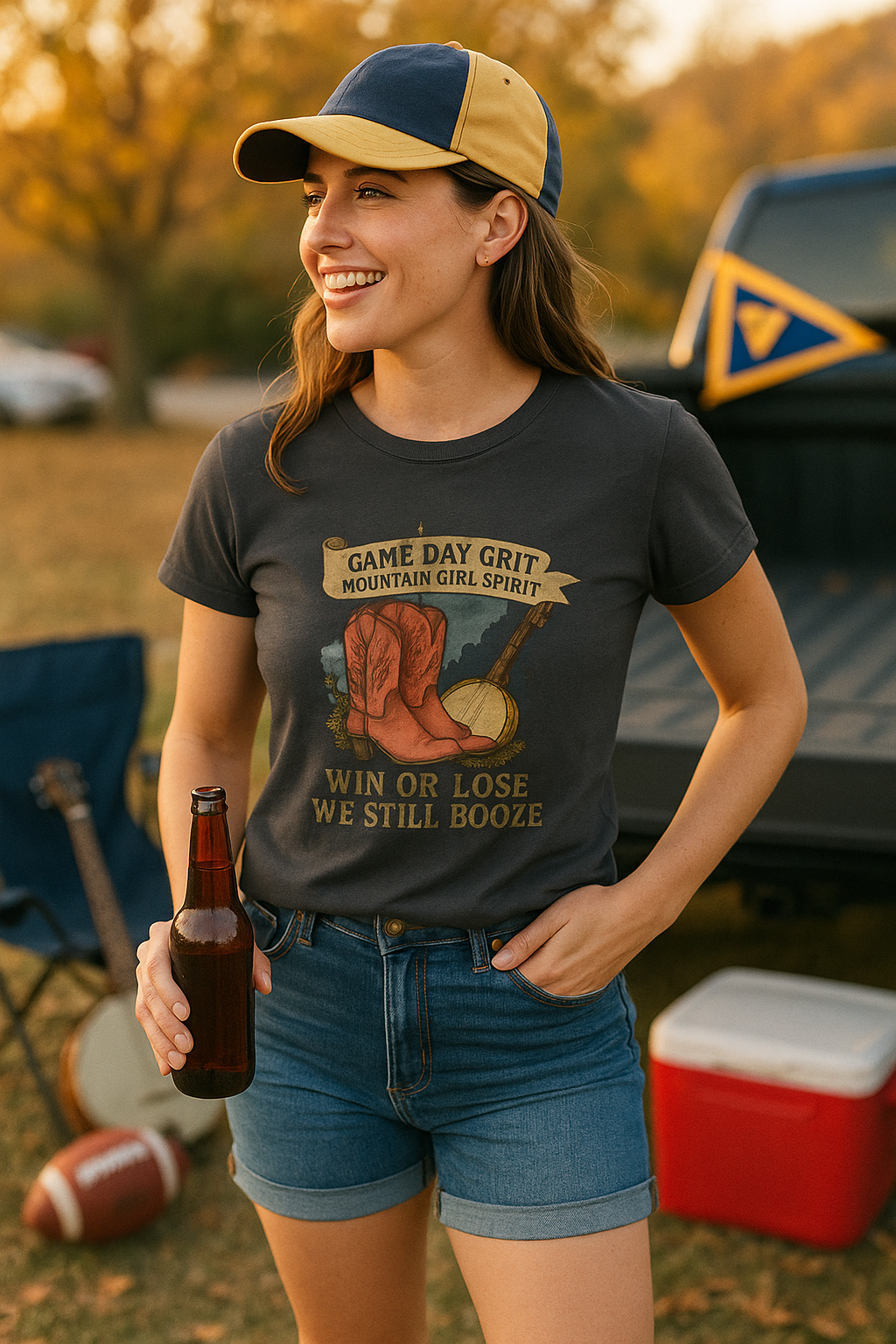 🍻 Game Day Grit – Mountain Girl Spirit Tee Loud, proud, and full of Appalachian soul — this t-shirt is for the girls who don’t back down and always bring the party. Featuring a vintage-inspired illustration of red cowboy boots, a banjo, and wildflowers, this tee is a playful nod to game day traditions and country pride. 🌄 Design Features: Banner reads: Game Day Grit, Mountain Girl Spirit Illustration includes a banjo, boots, and florals Bold phrase: Win or Lose, We Still Booze Hand-drawn, folk-style aesthetic Printed on a soft, lightweight tee perfect for layering or hot summer games 🧵 Product Details: Unisex fit (or women’s fitted – your choice) Cotton or cotton-blend fabric Machine washable Heather gray color pairs well with denim and boots Available in sizes S–3XL 🎁 Perfect For: WVU game days Tailgates and festivals Country music concerts Mountain girls, college students, and proud Southern women Bachelorette parties or girls’ weekends 🔥 Grab one for your whole crew and show up to the next tailgate in matching sass!