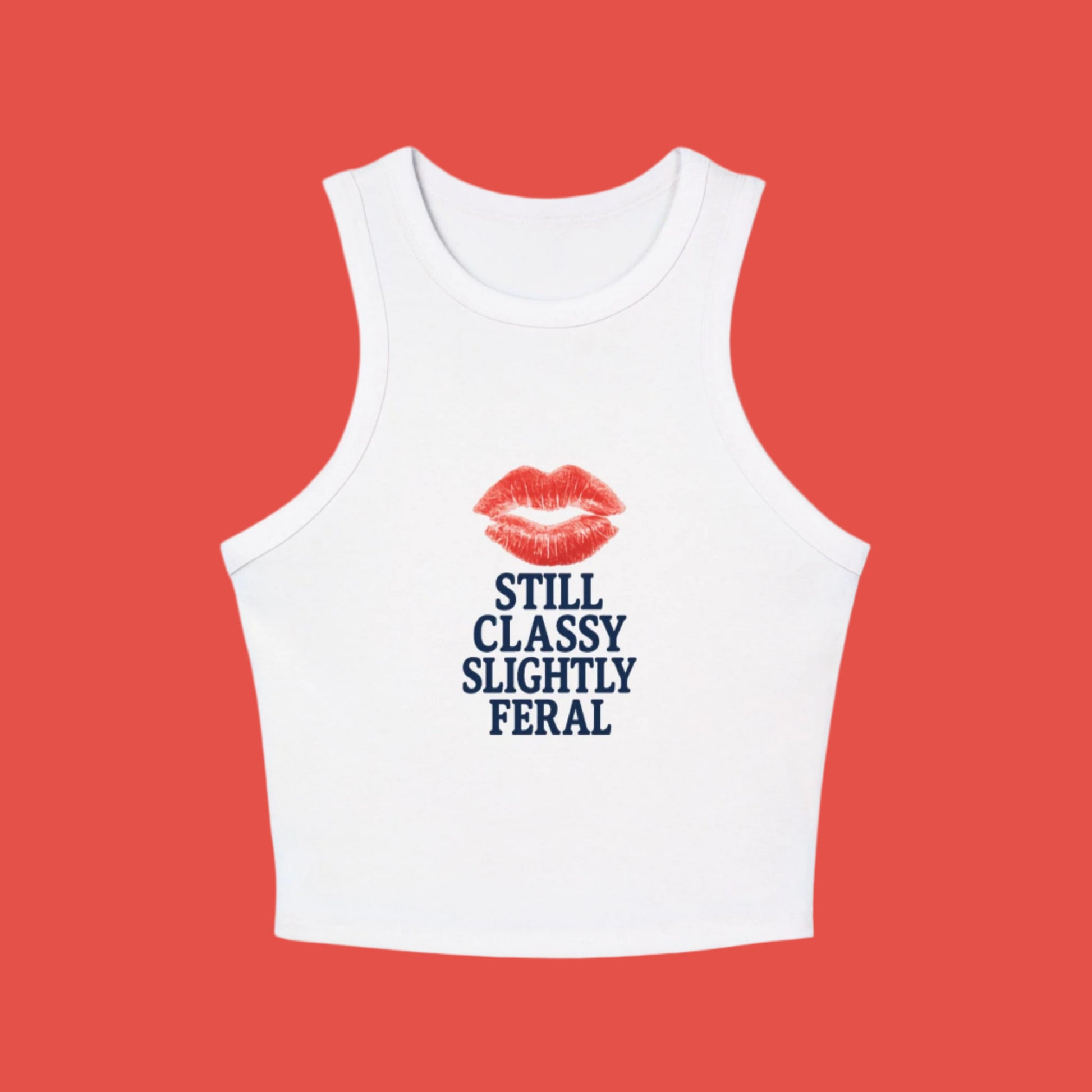 Still classy slightly feral cropped tank with a high neck style and mid-length cut. Offers a modern and chic look, perfect for layering or wearing on its own during various activities. Relevant to women looking for a stylish and comfortable top for casual wear or active lifestyle. Suitable for summer, beach days, festivals, and casual outings.