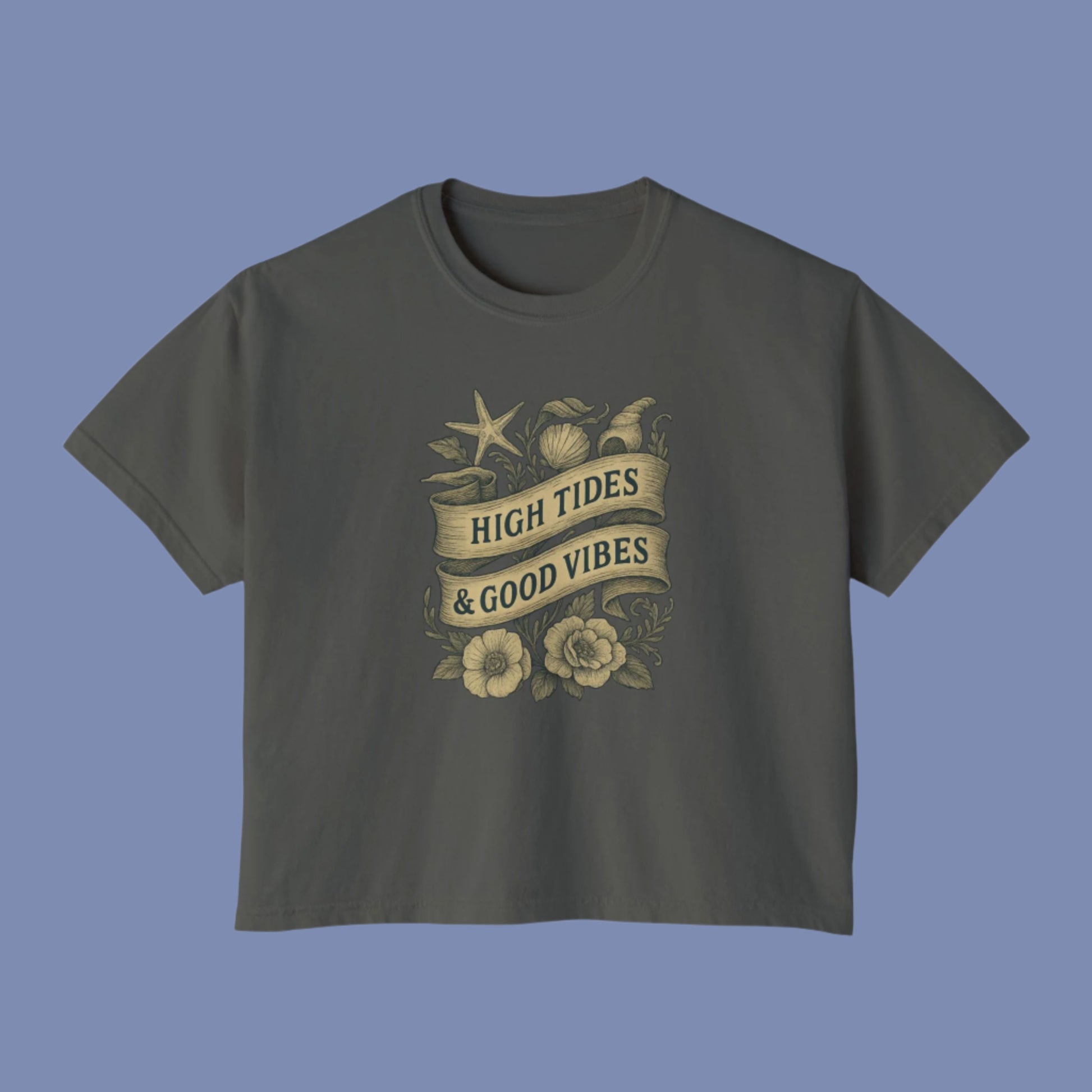 This High Tides and Good Vibes beached cropped boxy tee exudes a carefree and beachy atmosphere, perfect for casual summer days and seaside getaways. It is relevant for women who love the beach, summer vibes, and relaxed fashion. Ideal for wearing during beach trips, summer vacations, and casual outings.