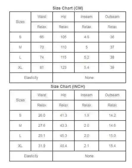 | Size | Waist | Hip | Inseam | Outseam |