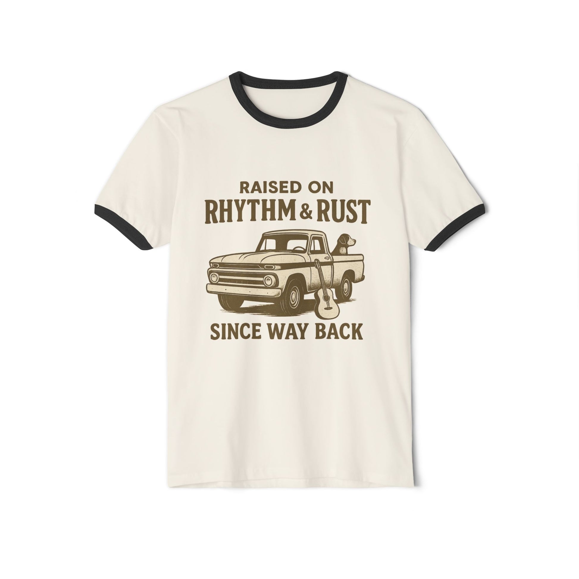 Vintage Ringer T-Shirt with Saying Raised on Rhythm and Rust, Unisex Tee, Retro Graphic Tee, Classic Cotton Shirt, 70s Inspired Top
