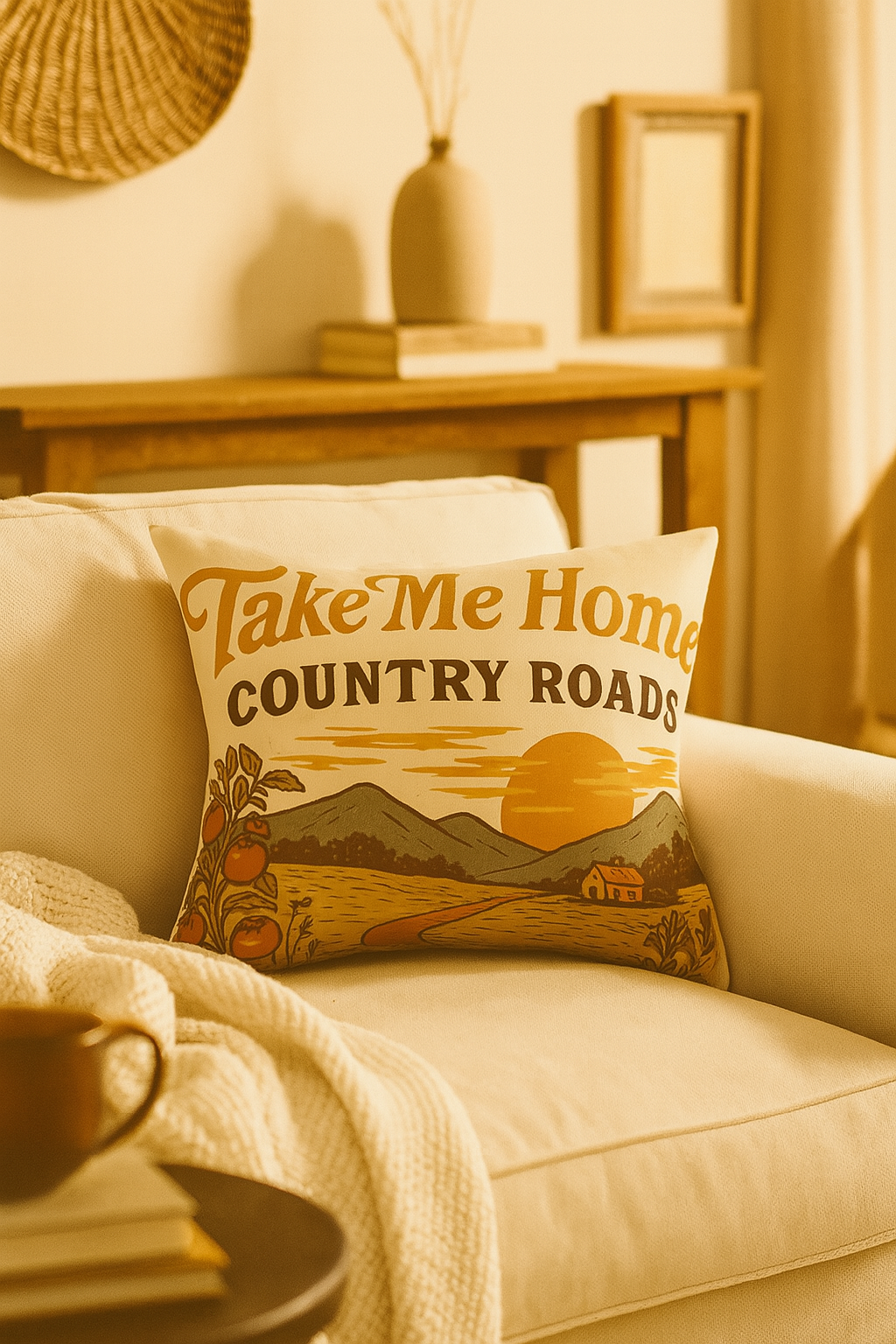 West Virginia Country Roads take me home throw pillow with a beautiful country scene