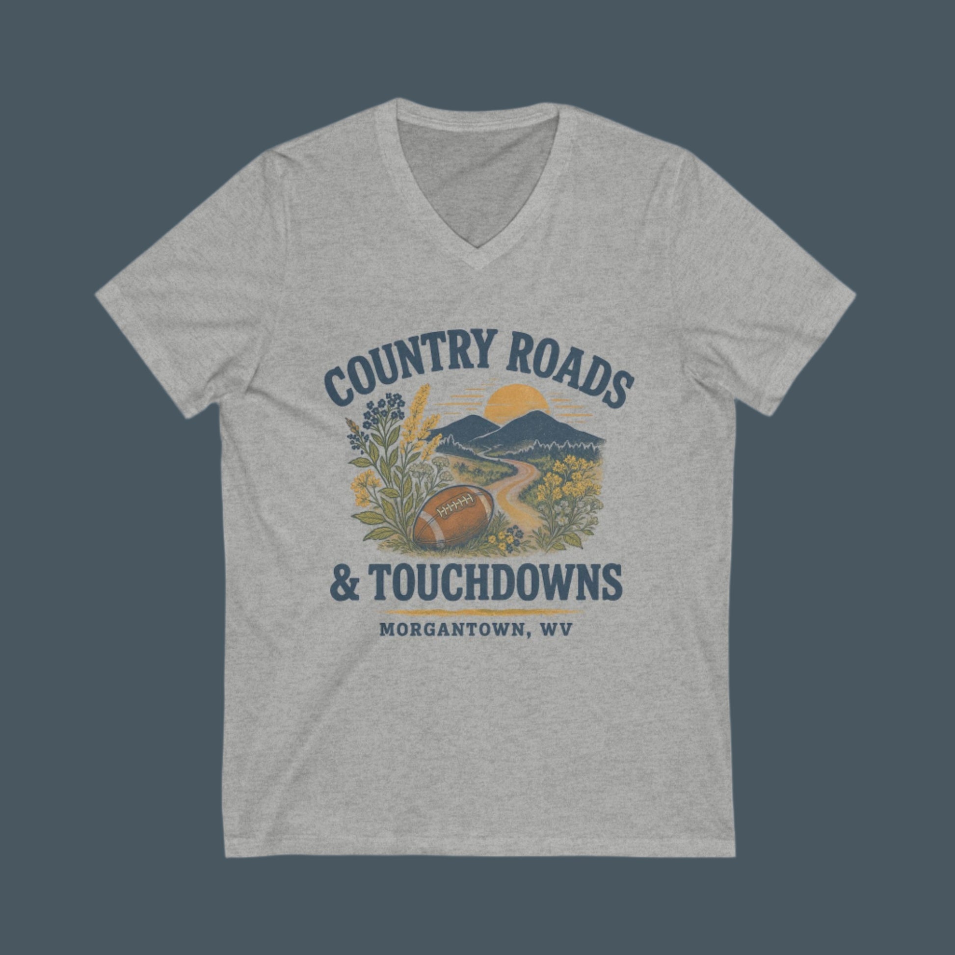 This country roads and touchdown football gameday V-neck t-shirt gives off a spirited and casual vibe, perfect for football fans looking to show their team spirit. It can be worn to football games or tailgates, making it a must-have. Relevant for football season, game days, and sports celebrations. Product features - 100% cotton fabric for comfort - Lightweight fabric suitable for all seasons - Stylish retail fit with V-neckline - Platinum WRAP certified for sustainable manufacturing - Tear-away label for convenience Care instructions - Do not dry-clean - Machine wash: warm (max 40C or 105F) - non-chlorine: bleach as needed - Tumble dry: low heat - Iron, steam or dry: medium heat