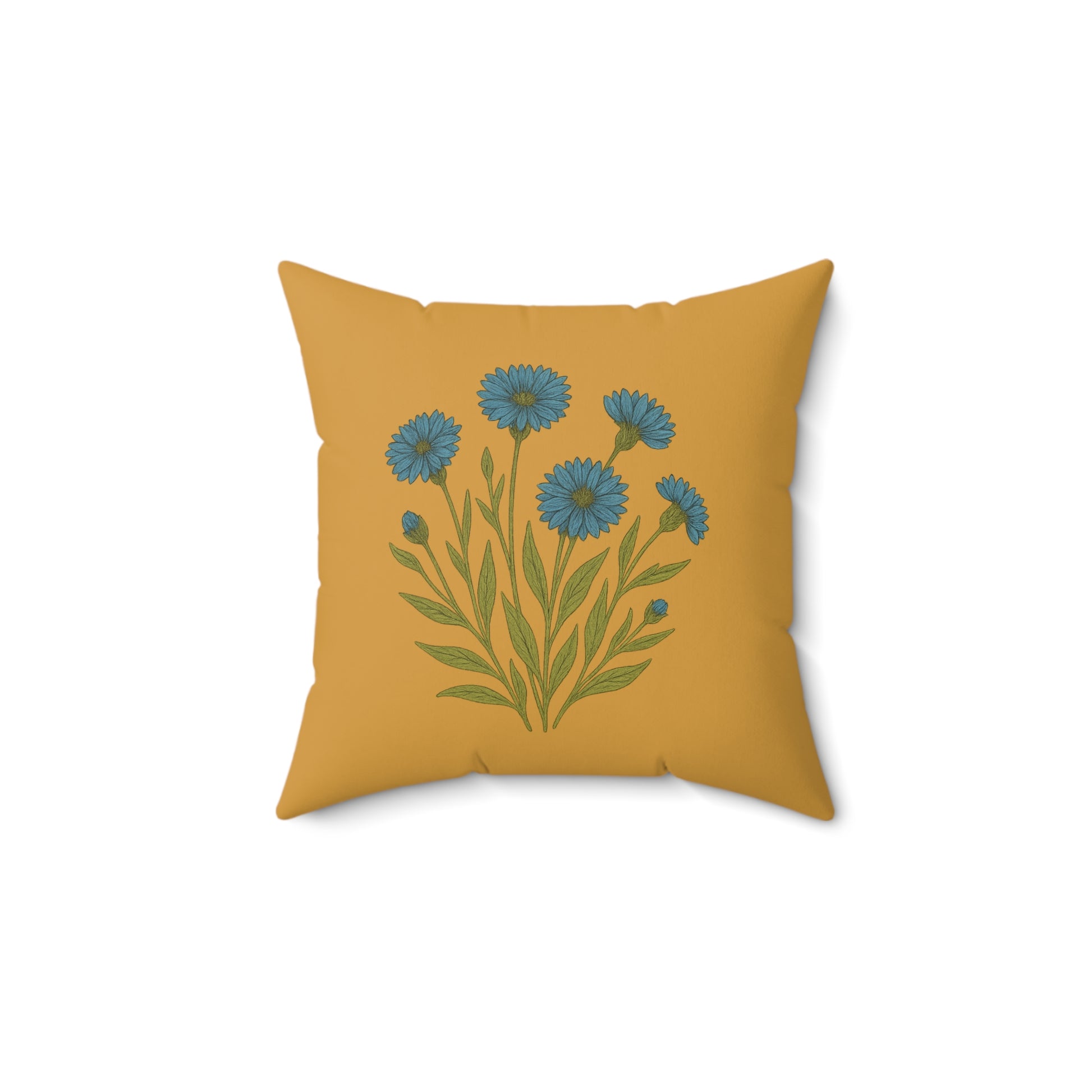 A golden colored square pillow from our wildflower collection featuring blue Appalachian wildflowers. This pillow adds a touch of nature to any room and is perfect for those who love floral designs. Ideal for spring and summer home decor, as well as nature lovers and garden enthusiasts. Looks great paired with our other wildflower pillows.