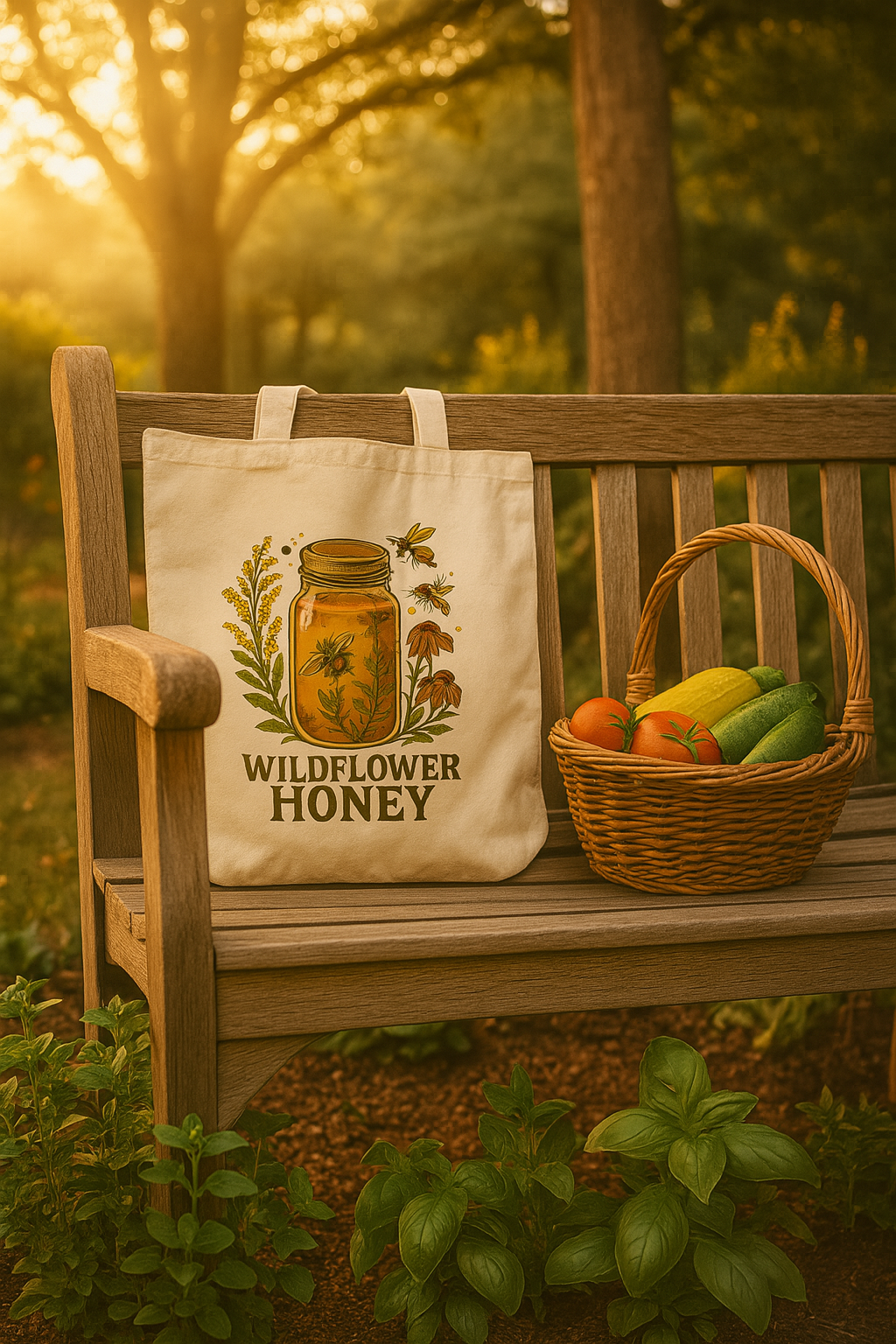 A stylish and eco-friendly Wildflower honey reusable market tote made from 100% cotton canvas. This tote bag gives off a natural and rustic vibe, perfect for environmentally conscious shoppers or nature lovers. Ideal for grocery shopping, farmer's market trips, or daily errands. Great for Earth Day celebrations or as a gift for someone who loves wildflowers. Product features - 100% Cotton canvas for durability - Flat corners for a seamless design - Reinforced stitching on carrying handles - Heavy fabric for added strength - Available in natural and black colors Care instructions - Do not iron directly over the printed area - print may stick to the iron. - Spot clean - Do not bleach - Line dry