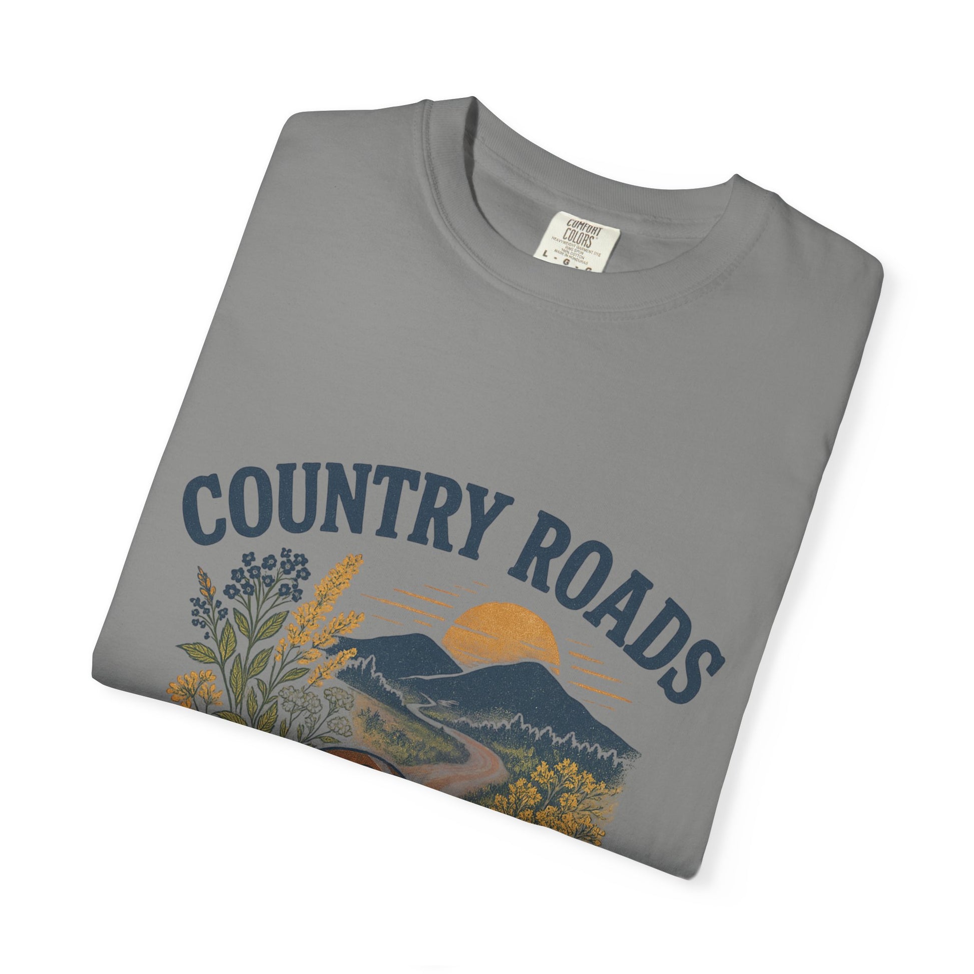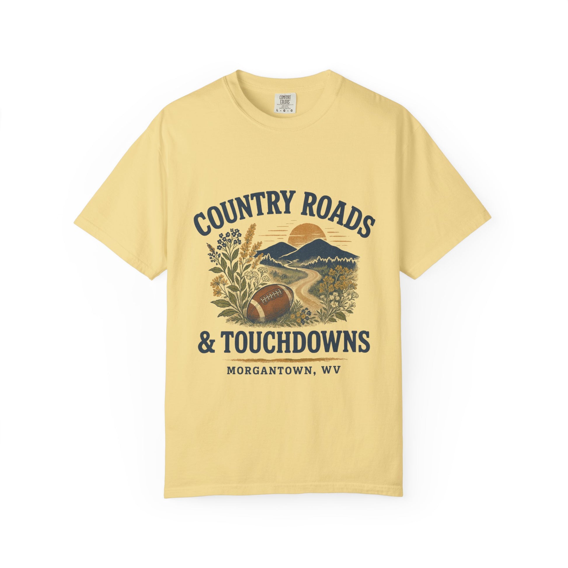 Get ready for game day with this WVU themed t-shirt, perfect for tailgating and cheering on your team. The country roads and touchdowns design gives off a spirited and festive vibe, making it a must-have for any WVU fan. This unisex garment-dyed t-shirt is ideal for adults looking for comfort and style on game day.